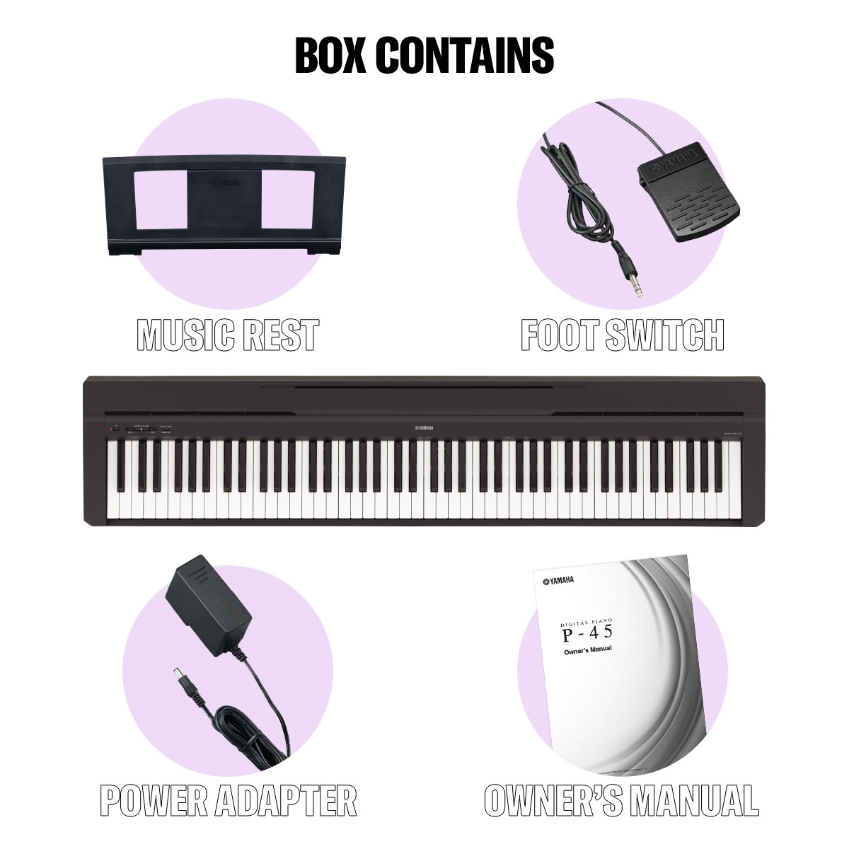 De Yamaha P45 is een erg gebruiksvriendelijke piano. De piano beschikt over één knop, waarmee diverse instellingen aangepast kunnen worden. Door het indrukken van deze knop in combinatie met het indrukken van een toets op het klavier, kunt u een instelling selecteren. Boven de toetsen staan de betreffende functies weergegeven, zoals verschillende klanken, demo’s of instellingen van het metronoom. In totaal beschikt de piano over tien verschillende geluiden, waaronder een aantal piano’s, maar ook orgelgeluiden en klanken van snaarinstrumenten.