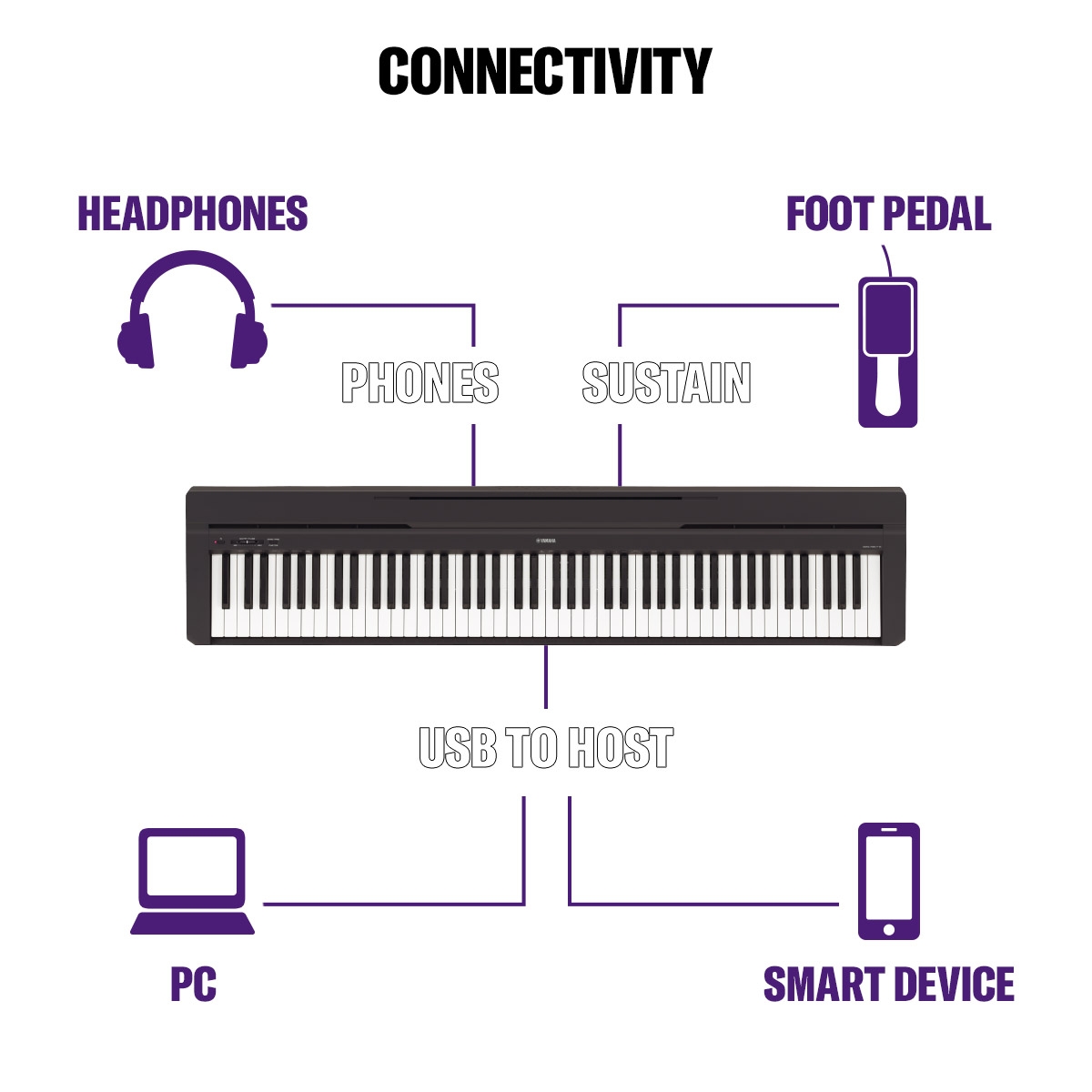 U kunt uw Yamaha P45 Portable Piano compleet maken met diverse accessoires. Veel aangekocht samen met de piano is het L-85 statief, een origineel onderstel. Optisch toont de piano mooier op dit statief wat naadloos aansluit op het model van de P45 en de stabiliteit neemt toe. Een andere upgrade is een beter sustainpedaal. Standaard wordt de piano geleverd met de FC-5, dit is een kunststofblokje wat prima functioneert. Het optionele FC-4 pedaal is lepelvorming en vergroot het speelcomfort. Gaat u de piano regelmatig vervoeren? Dan mag de SC-KB850 tas niet ontbreken. Deze tas is op maat gemaakt zodat de piano optimaal beschermd is tijdens transport. Het voorvak is ruim genoeg zodat de lessenaar hier veilig kan worden opgeborgen.